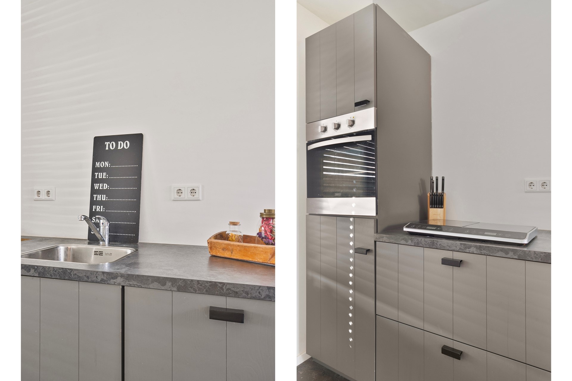 Entree, hal met meterkast. Deze hal geeft toegang tot de woonkamer en de keuken. De keuken is ruim van opzet en licht door zowel een raam aan de voor- als achterzijde. De huidige opstelling is als tijdelijke keuken geplaatst, maar functioneert prima. De woonkamer is voorzien van een fraaie vloer en de wanden zijn strak en licht afgewerkt. Vooral de balkconstructie aan de achterzijde van de kamer is een echte eyecatcher. In de vaste kast is de C.V. opgesteld, daarnaast bevindt zich het toilet. Aan de achterzijde van de woning ligt nog een ruime tuinkamer / serre. Deze ruimte heeft momenteel niet direct een functie, maar kan door het plaatsen van een (schuif)pui, prima bij de woonkamer getrokken worden. Dat geeft nog eens 13 m2 extra die nu niet is meegenomen als woonoppervlakte.