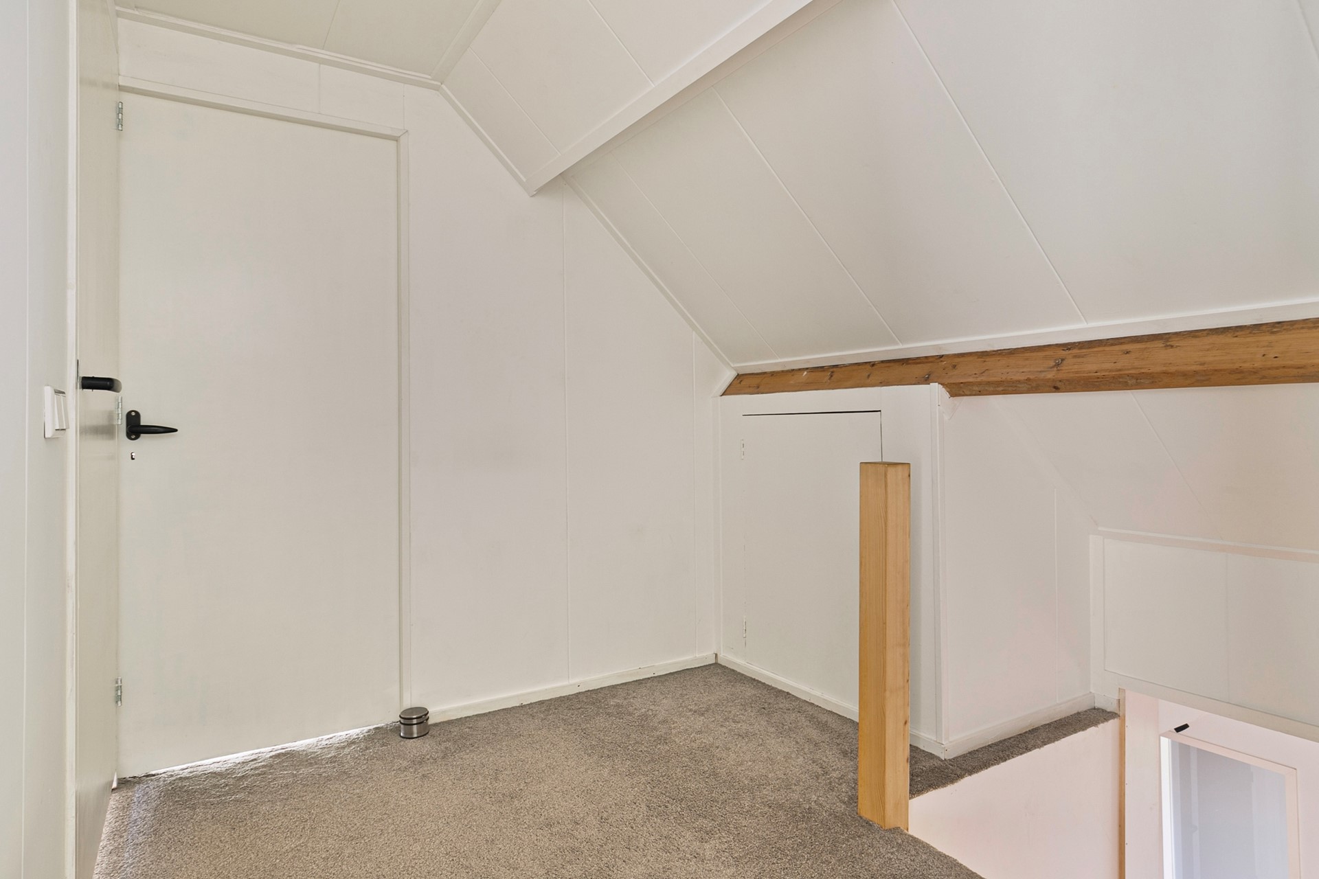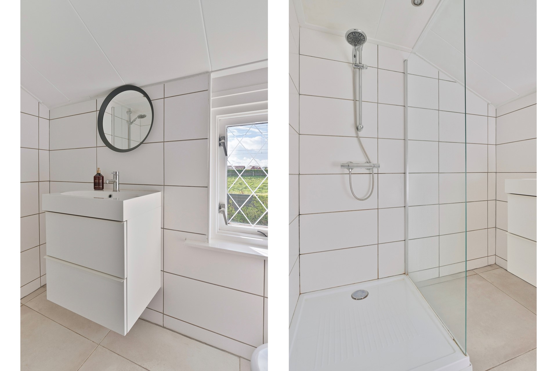 Ruime overloop met toegang tot twee ruime slaapkamers. De moderne badkamer is voorzien van een douche, wastafel en tweede toilet. Op de overloop en achter de knieschotten bevindt zich nog veel bergruimte.